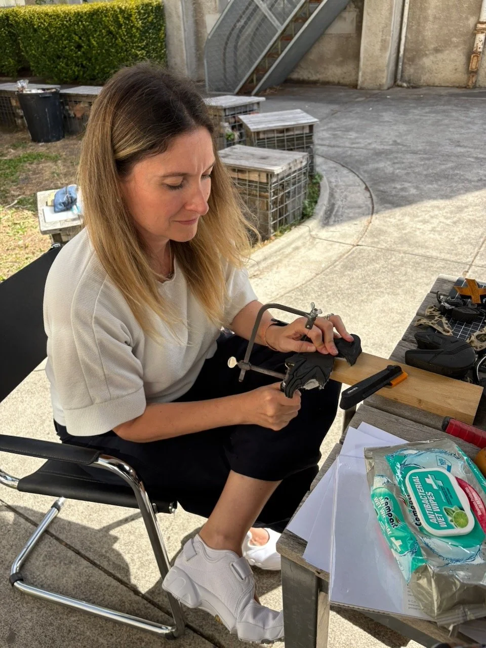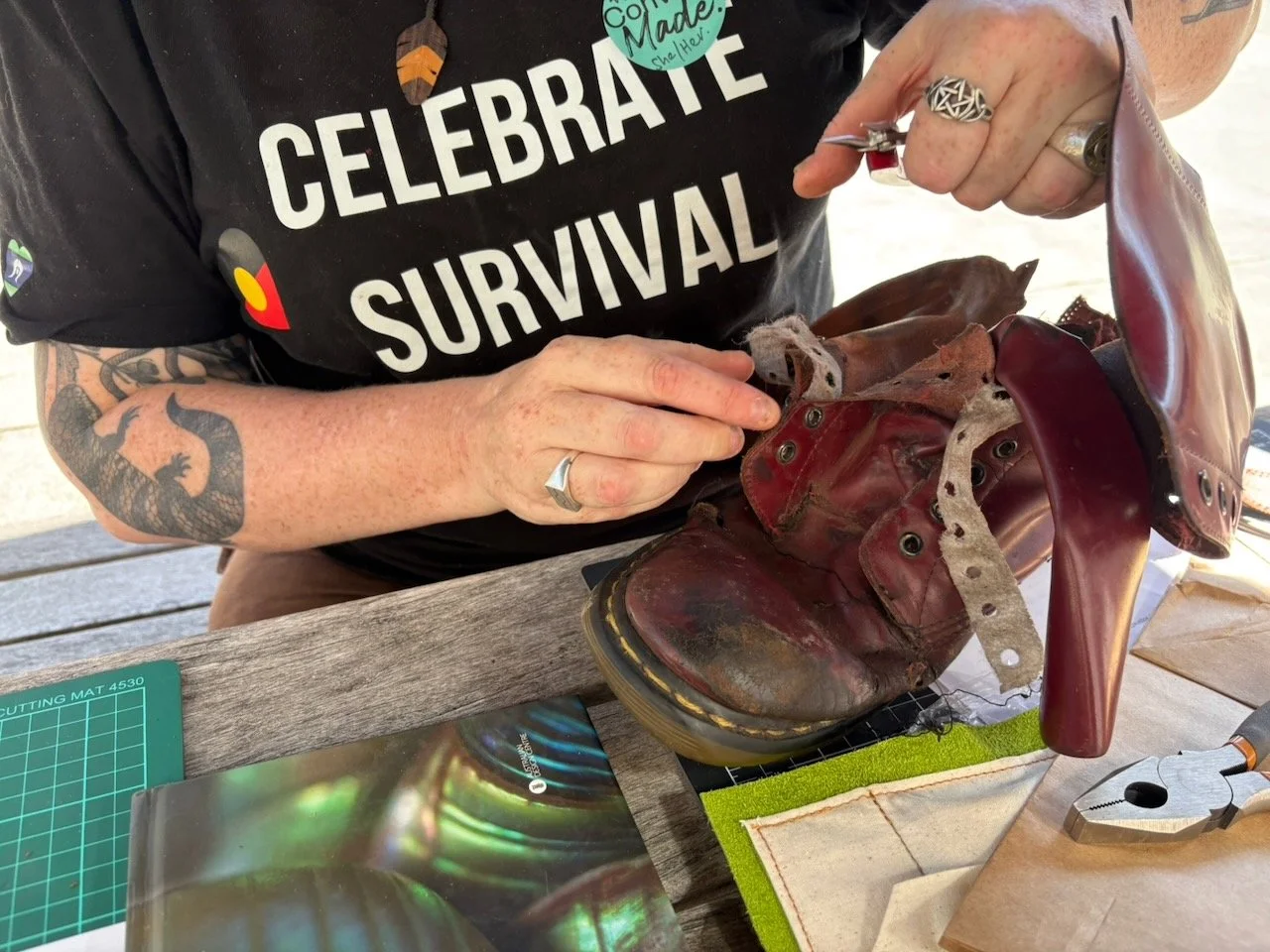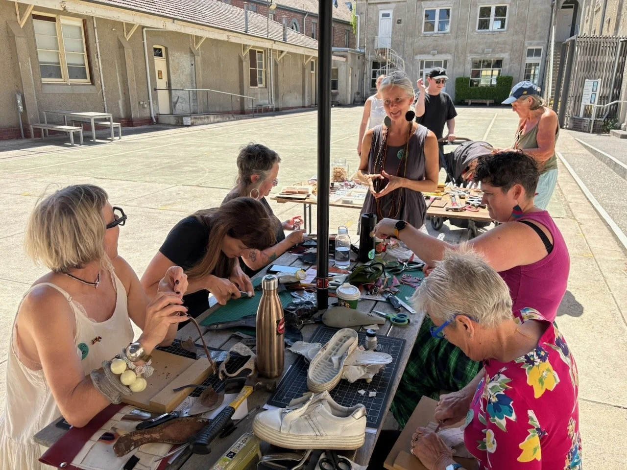 Shoes are vessels. Artist and maker Jo Cope, whose practice centres on the stories objects carry, has long spoken about this quality in her own work with footwear, and it was the subject of a recent episode of The Social Lives of Shoes podcast. As we sat together with shoes that had earned an afterlife, in the sunshine and beautiful surroundings of the Abbotsford Convent (a place with its own deep and complicated history), something shifted. People from entirely different walks of life found themselves sharing stories, connecting across experiences they might never otherwise have exchanged. The shoes provided the medium. The workshop provided the time and the permission to slow down and actually pay attention to these meaningful objects, and to each other.