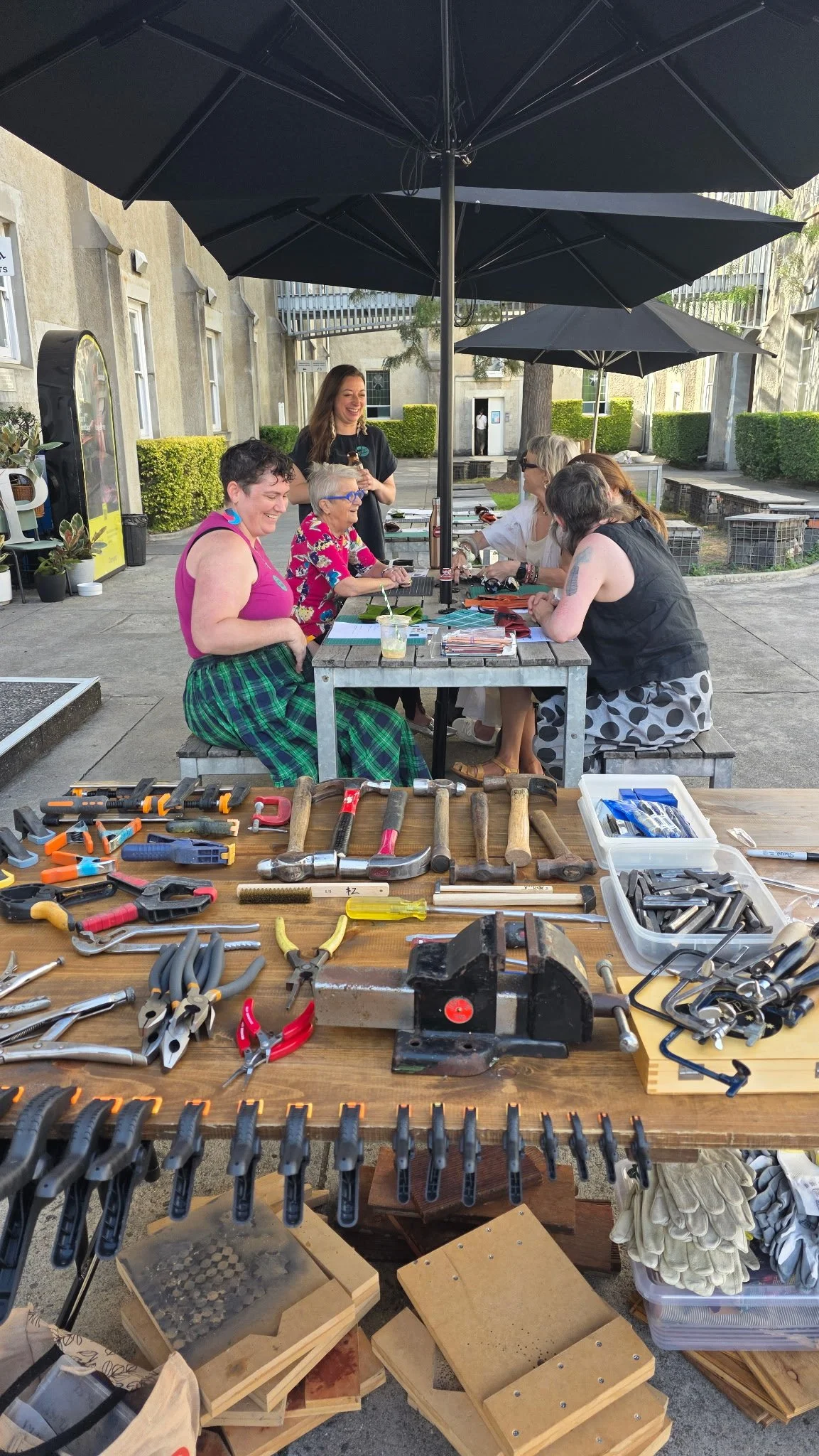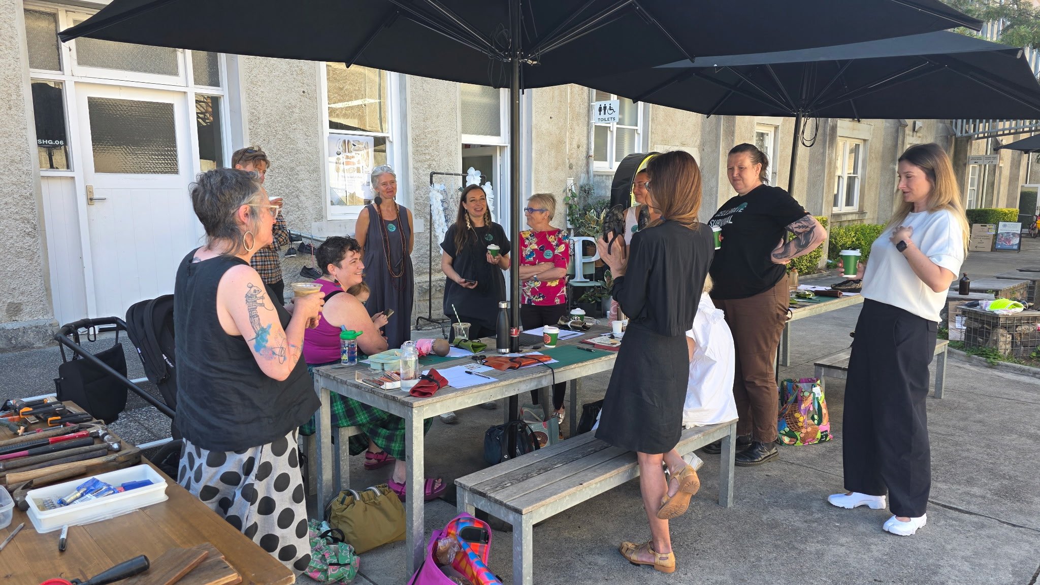 Workshop participants engaging in footwear deconstruction and conversation in the picturesque Sacred Heart Courtyard at the Abbotsford Convent. Alexandra Sherlock, 2026.
