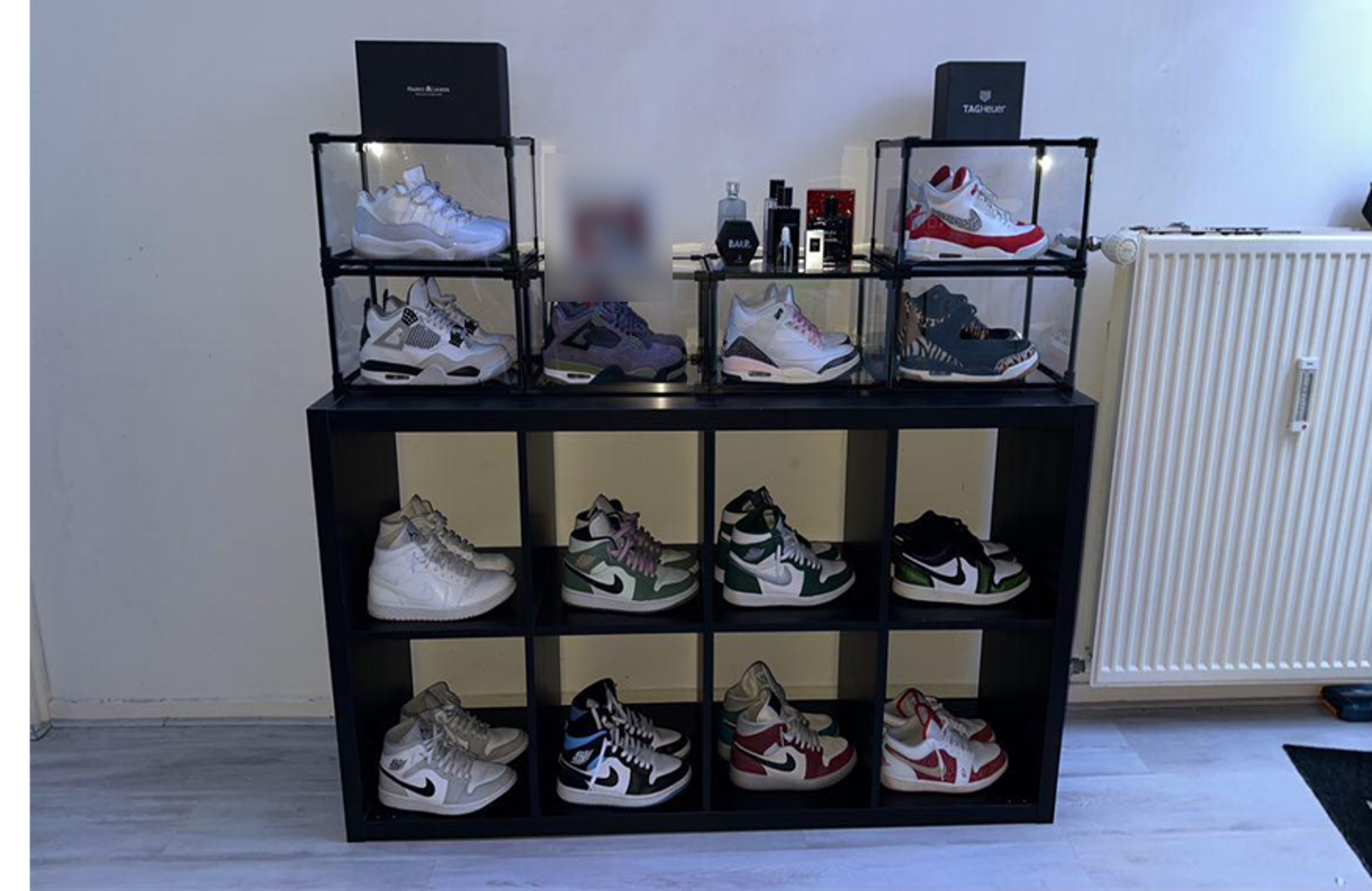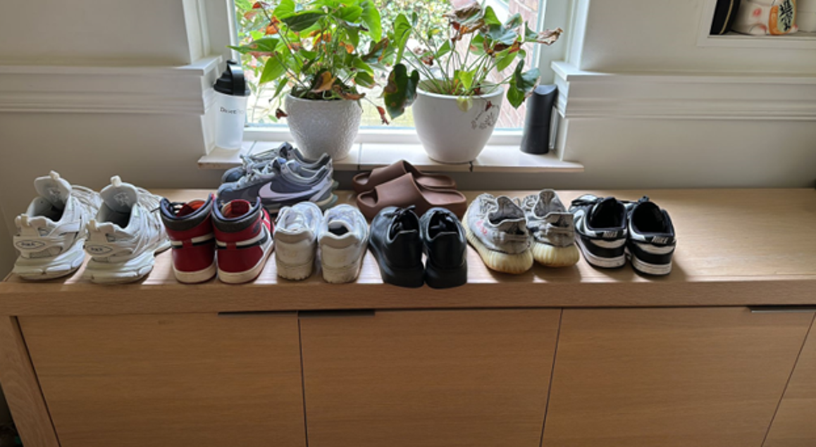 “Vance” and his sister display their weekly sneaker rotations side-by-side (split down the middle, left and right respectively) on top of a cabinet located in their family’s front hall entranceway. (Image: The Authors, 2025)